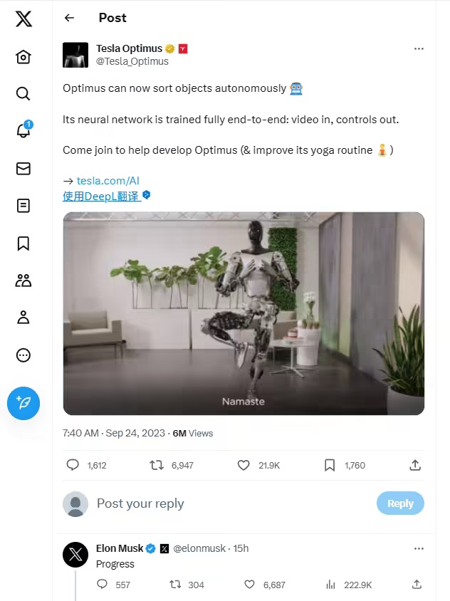 日前,特斯拉 Optimus 的官方 X 账号上传了一段新视频:这种人形机器人现已取得进化,现在可以仅依托视觉来对物体进行分类,还能完结瑜伽动作了。对此,马斯克如同也难掩心里激动,在谈论区直言:Progress(前进)。